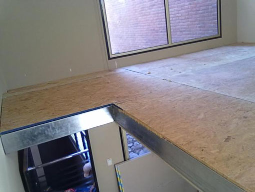 Depois da criação da estrutura com as vigas de aço, colocamos as placas de OSB fixando as mesmas com parafusos da SFS, por forma a que este esteja em condições de receber o acabamento final.